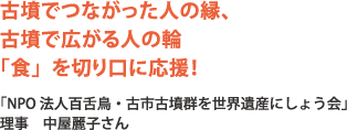 百舌鳥・古市古墳群の世界文化遺産登録の活動を通じて、地域の産業が発展し、地域の元気につなげたいと考えています。